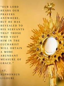 As human beings, composed of both body and soul, we find comfort and strength in not only recognizing God's spiritual presence throughout our world, but also in the small white Host, placed before us for our adoration. Such humility He has, as St. Therese exclaimed, to become a "prisoner of love" for us, with His splendor hidden and veiled from us behind the appearance of mere bread. You can pray anywhere, it is true, but the personal relationship with Jesus Christ that grows with time in prayer before the Blessed Sacrament is a unique source of encouragement and peace. Rather than take away from the importance and central aspect of the Mass, the practice of Eucharistic Adoration should complement the Mass.